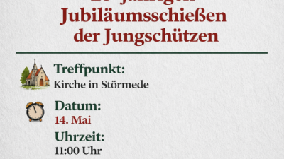 Am kommenden Samstag, 07.03.2026, veranstaltet die St.-Pankratius-Schützenbruderschaft Störmede wieder ihren alljährlichen Seniorennachmittag. Hierzu lädt der Vorstand um Oberst Hubertus Sprink alle Ehrenschützen der Bruderschaft ganz herzlich in den Speiseraum der Schützenhalle ein. Die Veranstaltung beginnt um 15:00 Uhr. Es werden Weiterlesen…
