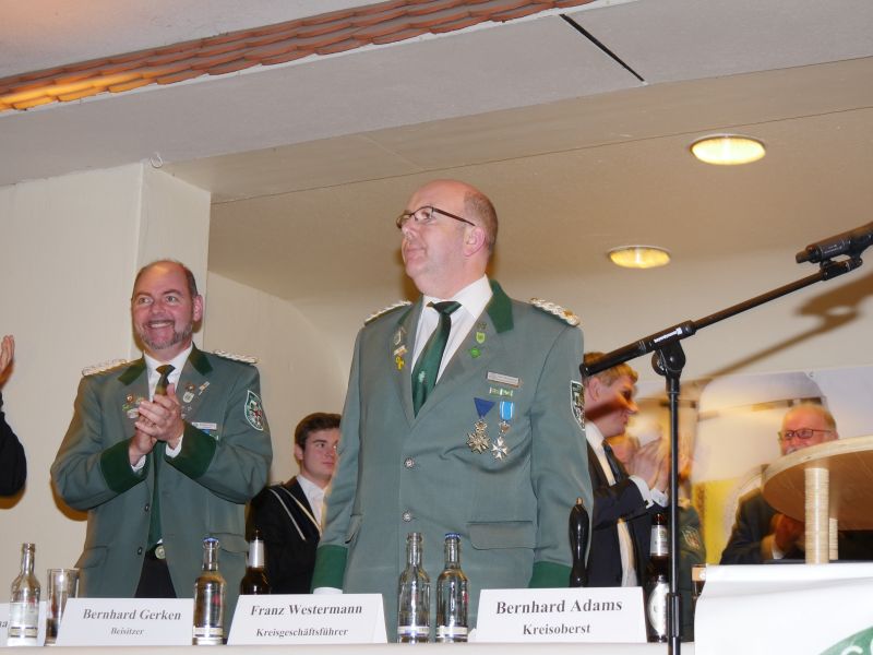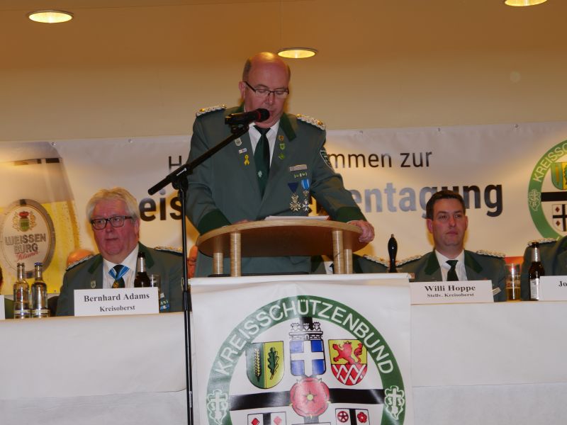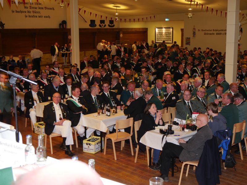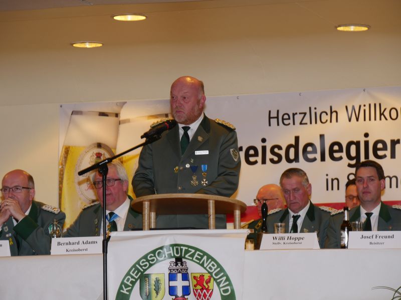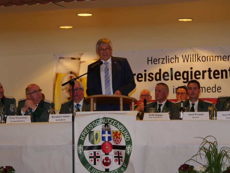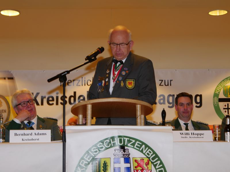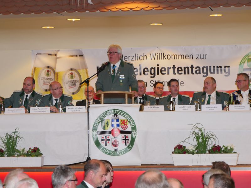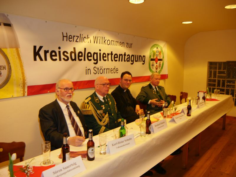 Am 24.03.2017 hat in der Störmeder Schützenhalle die Kreisdelgiertentagung des KreisschützenbundesLippstadt stattgefunden. Der Kreisvorstand konnte in der voll besetzten Schützenhalle die Delegationen von 65 Schützenvereinen aus der Region begrüßen. Nach dem Einmarsch der Fahnen des gastgebenden Vereins und der Kreisstandarte eröffnete Kreisoberst Bernhard Adams die Versammlung. Die Tagesordnung sah neben den verschiedensten Grußworten von Vertretern aus der Politik, den Repräsentanten des Sauerländer Schützenbundes sowie Oberst Peter Stephan und anderen auch den Geschäftsbericht und die mit Spannung erwartete Wahl zum neuen Kreisvorstand vor. Kreisoberst Bernhard Adams und der stellv. Kreisoberst Willi Hoppe-Nucke schieden nach 18 bzw. 8 Jahren Vorstandarbeit aus dem Amt aus. Als Nachfolger wurden der amtierende Kreisgeschäftsführer Franz Westermann aus Langeneicke zum Kreisoberst, Beisitzer Josef Freund zum stellv. Kreisoberst und Beisitzer Bernhard Gerken zum Kreisgeschäftsführer gewählt. Den Vorstand komplettieren Stepan Deimel aus Hemmern und Markus Christ aus Bad Westernkotten als Beisitzer. In den Beirat wurden Heinfried Buschkühl aus Effeln und Tobias Fernim aus Meiste gewählt. Auf Antrag des Kreisvorstandes wurden Bernhard Adams zum Kreisehrenoberst und Willi Hoppe zum Kreisehrenmitglied ernannt. Verabschiedet wurden sie mit einem großen Zapfenstreich unter Begleitung des Tambourkorps Störmede; Leitung Tambourmajor Hans-Reiner Beklas und des Musikzuges der freiwilligen Feuerwehr Störmede; Leitung Berthold Kutscher.