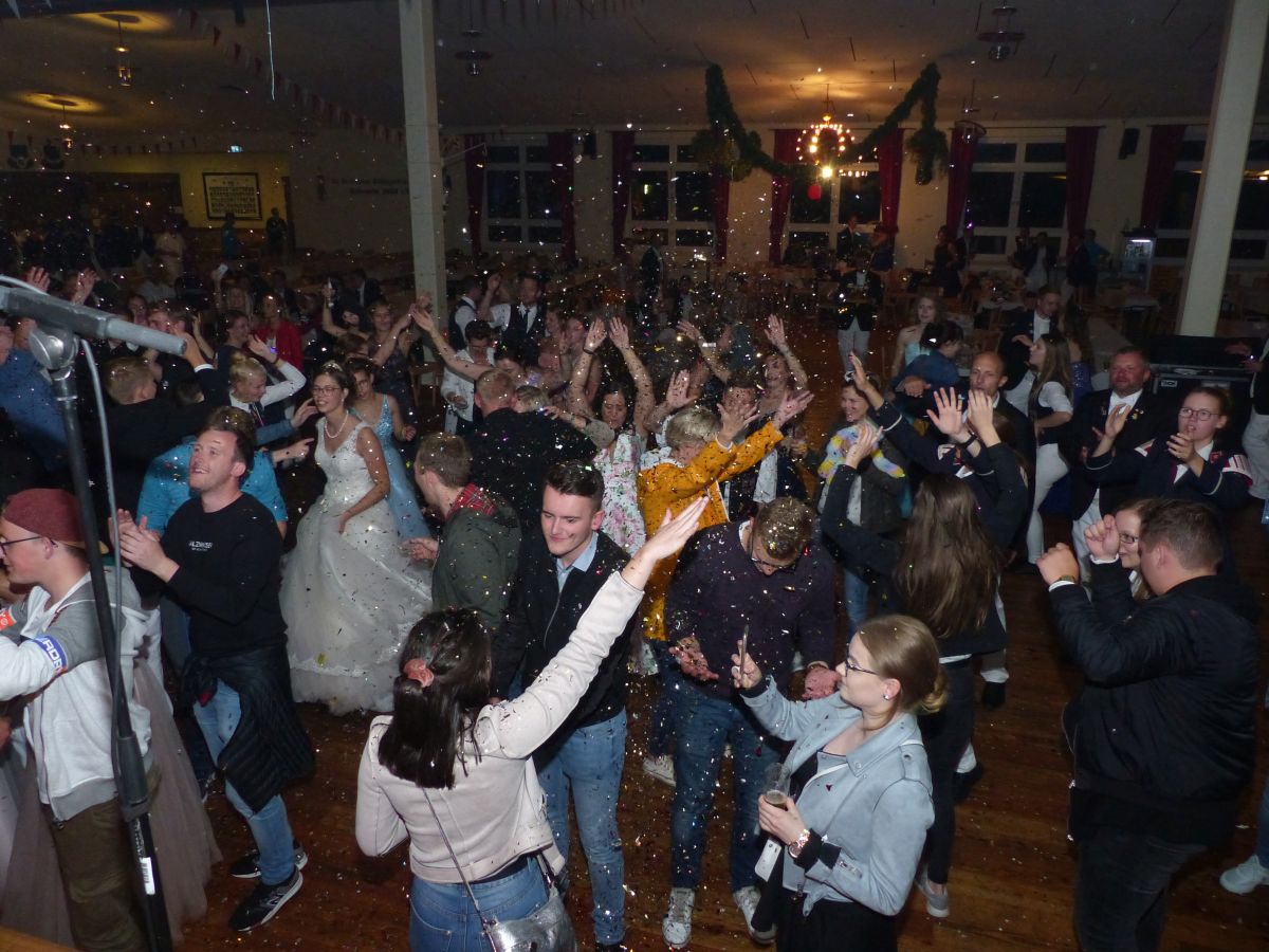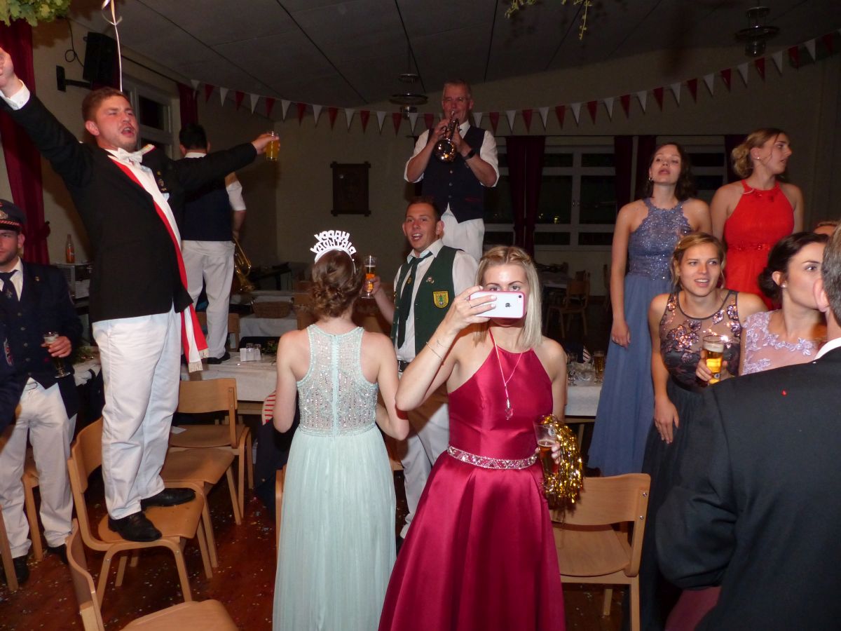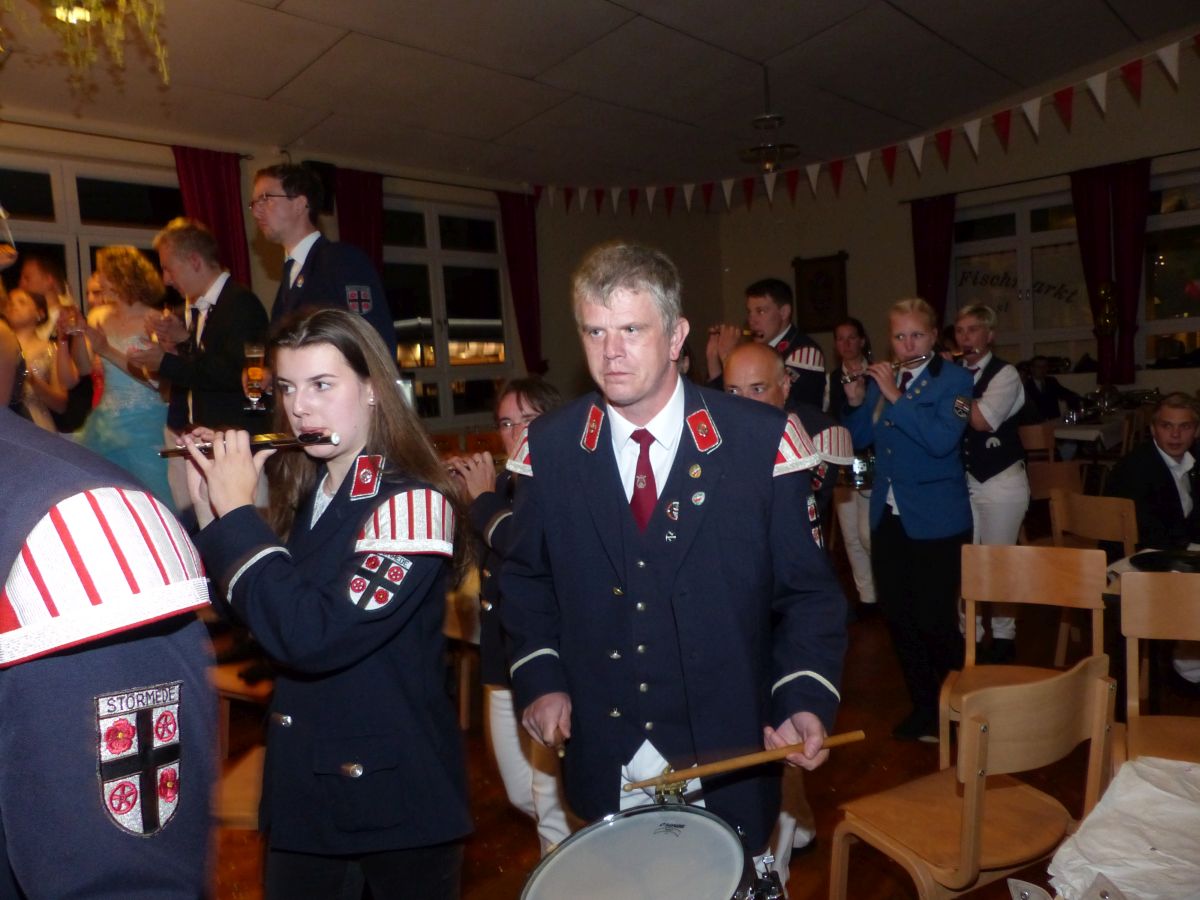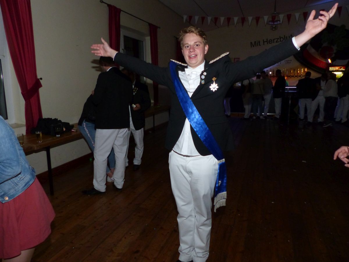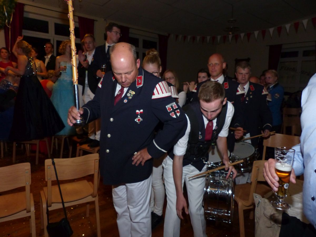 Antreten an der Kirchstraße, 16:45 Uhr, Telefonat des Oberst mit der Königsresident… Kurze Info an den Vorstand: Boarding not completed… dauert noch etwas… Dann um 17:00 ging es los. kurzer Weg von Chappi bis zur Langen Straße in die Königsresidenz, Oberstadju holte das Königspaar und die Hofdamen zum Abnehmen der Front. Danach war aber auch jedem klar, warum es diese kleine zeitliche Verzögerung gegeben hatte: bis 28 Hofdamen „eingecheckt“ haben, dauert es einfach seine Zeit. Bestens gelaunt zeigten sich dann König Dennis Brinkhaus und Königin Clraissa Kosfeld und ihre Hofdamen der Störmeder Öffentlichkeit. Nachdem Parademarsch auf dem Schützenplatz kam Oberst Peter Stephan ob des farbenfrohen Bildes der Hofdamen in ihren Kleider aus dem Schwärmen nicht mehr heraus. Nach dem Marsch erhielt Clarissa von Oberst Peter Stephan den obligatorischen Königinnenorden angesteckt. Zeit bleibt nicht wirklich viel, denn sogleich startete der Photographiemarathon in Stefan Pohles Garten, es folgte natürlich der Kindertanz bei dem die Großen und Kleinen wirklich toll mitmachten. Wichtig für den Montagnachmittag ist natürlich die Polonaise, die von Oberst Peter Stephan und seiner Frau Ingrid und dem Königspaar angeführt wird und die bei strahlendem Sonnenschein ein stimmungsvolles Bild abgab.  Nach den anstehenden Ständchen des Tambourkorps Störmede, des Tambourkorps Ehringhausen sowie des SUS Störmede,  rockte „Livehaftig“ letzmalig den Saal, Spaß bis in die frühen Morgenstunden war garantiert. Und wie sollte es anders sein: Gaaaanz zum Schlus…. blies der Jubelkönig ein letztes Lied auf der Trompete.