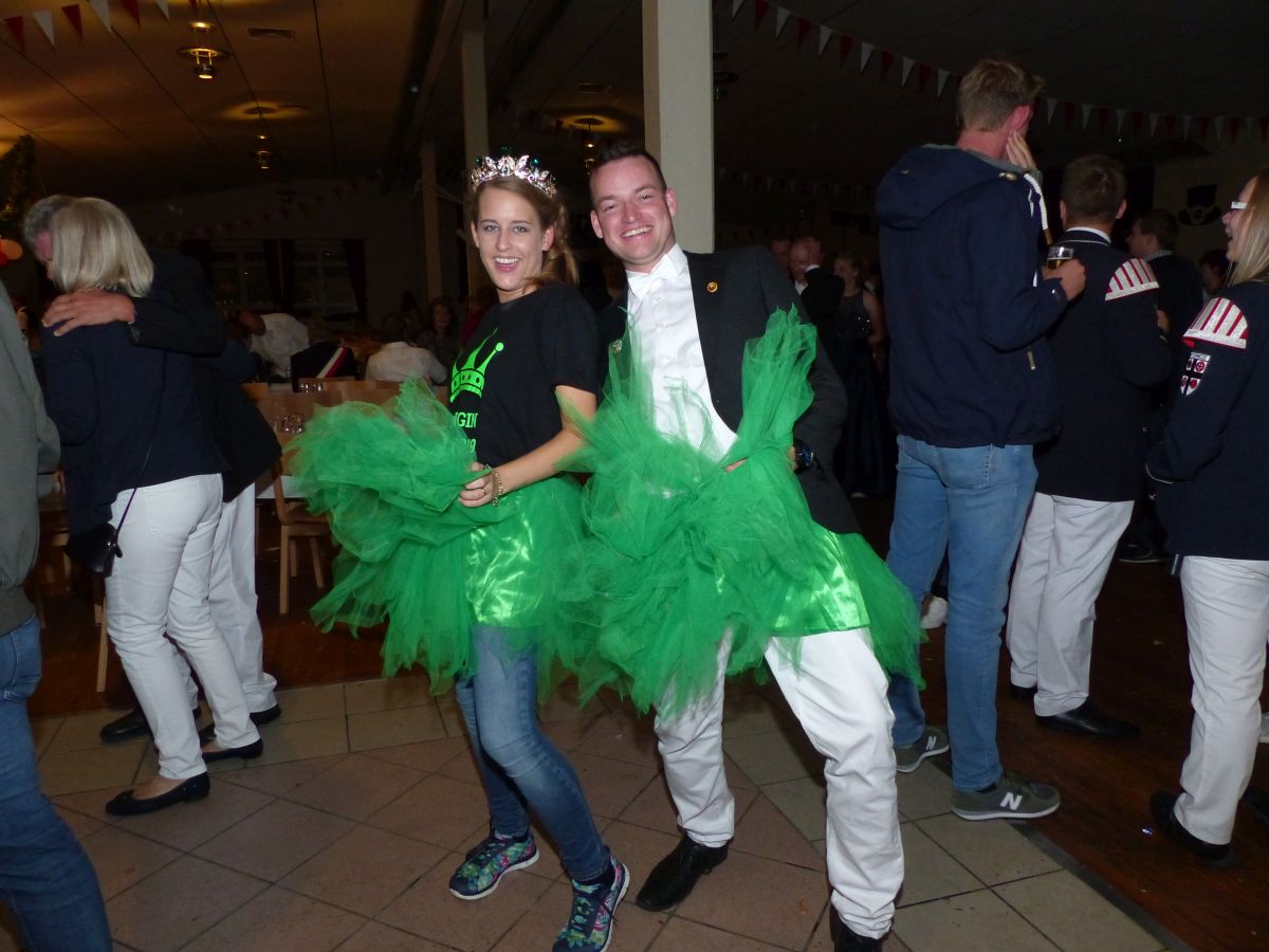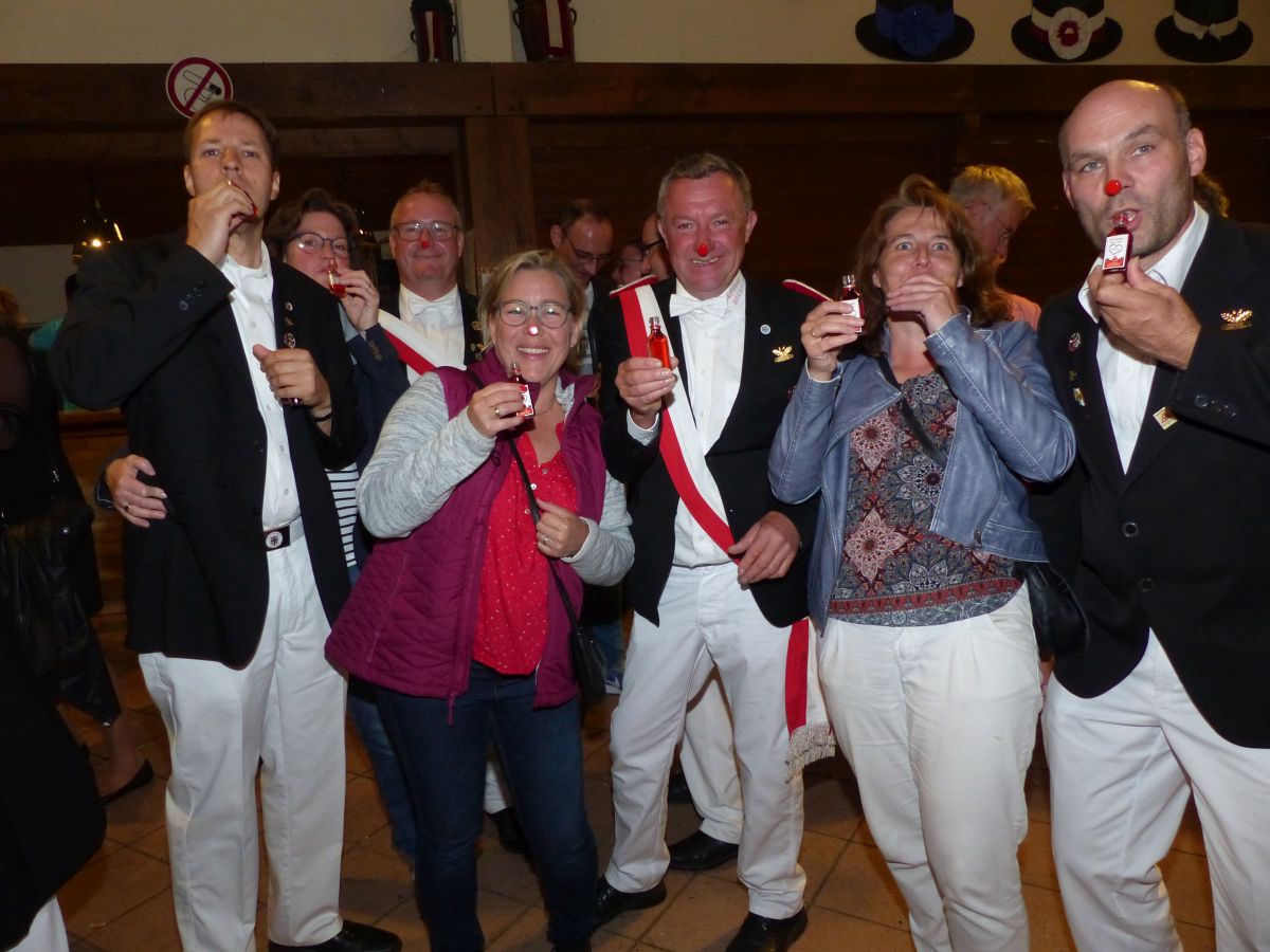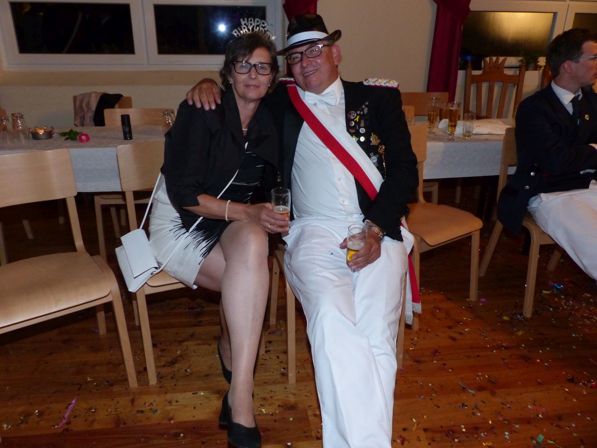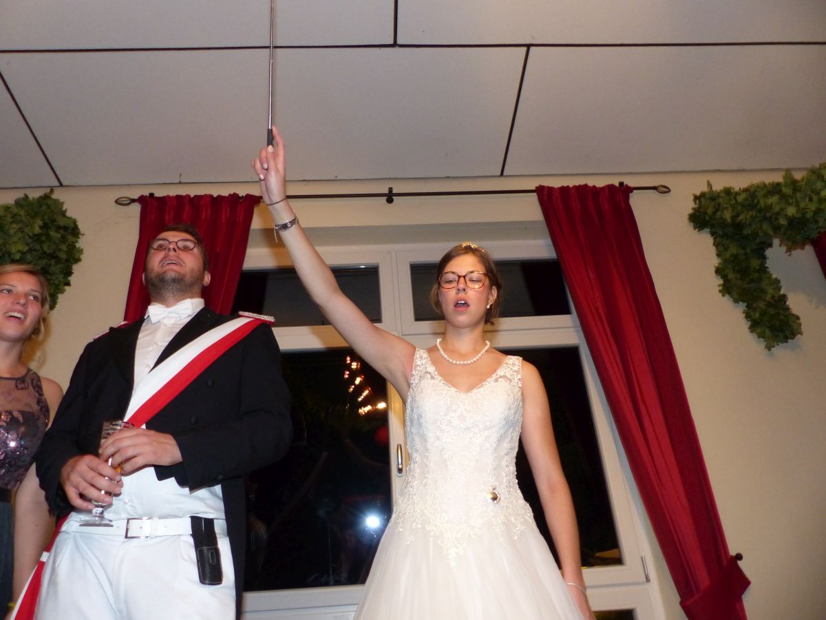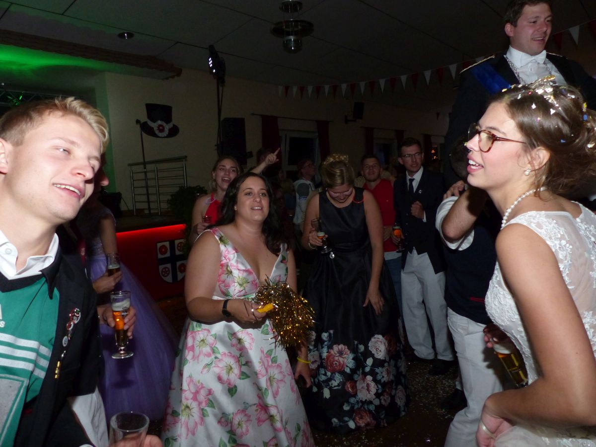Antreten an der Kirchstraße, 16:45 Uhr, Telefonat des Oberst mit der Königsresident… Kurze Info an den Vorstand: Boarding not completed… dauert noch etwas… Dann um 17:00 ging es los. kurzer Weg von Chappi bis zur Langen Straße in die Königsresidenz, Oberstadju holte das Königspaar und die Hofdamen zum Abnehmen der Front. Danach war aber auch jedem klar, warum es diese kleine zeitliche Verzögerung gegeben hatte: bis 28 Hofdamen „eingecheckt“ haben, dauert es einfach seine Zeit. Bestens gelaunt zeigten sich dann König Dennis Brinkhaus und Königin Clraissa Kosfeld und ihre Hofdamen der Störmeder Öffentlichkeit. Nachdem Parademarsch auf dem Schützenplatz kam Oberst Peter Stephan ob des farbenfrohen Bildes der Hofdamen in ihren Kleider aus dem Schwärmen nicht mehr heraus. Nach dem Marsch erhielt Clarissa von Oberst Peter Stephan den obligatorischen Königinnenorden angesteckt. Zeit bleibt nicht wirklich viel, denn sogleich startete der Photographiemarathon in Stefan Pohles Garten, es folgte natürlich der Kindertanz bei dem die Großen und Kleinen wirklich toll mitmachten. Wichtig für den Montagnachmittag ist natürlich die Polonaise, die von Oberst Peter Stephan und seiner Frau Ingrid und dem Königspaar angeführt wird und die bei strahlendem Sonnenschein ein stimmungsvolles Bild abgab.  Nach den anstehenden Ständchen des Tambourkorps Störmede, des Tambourkorps Ehringhausen sowie des SUS Störmede,  rockte „Livehaftig“ letzmalig den Saal, Spaß bis in die frühen Morgenstunden war garantiert. Und wie sollte es anders sein: Gaaaanz zum Schlus…. blies der Jubelkönig ein letztes Lied auf der Trompete.