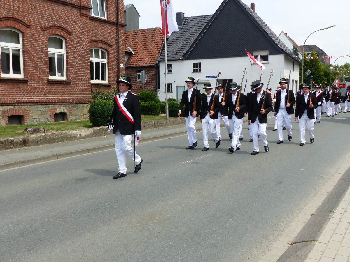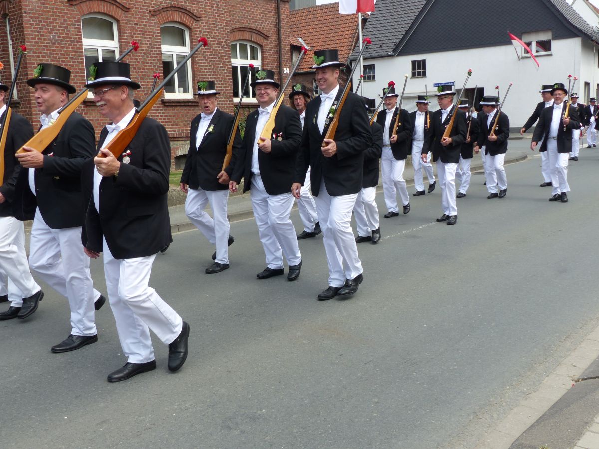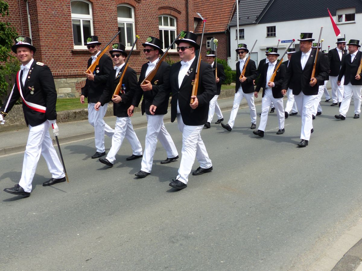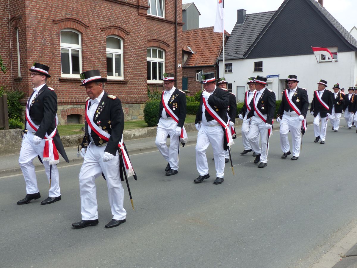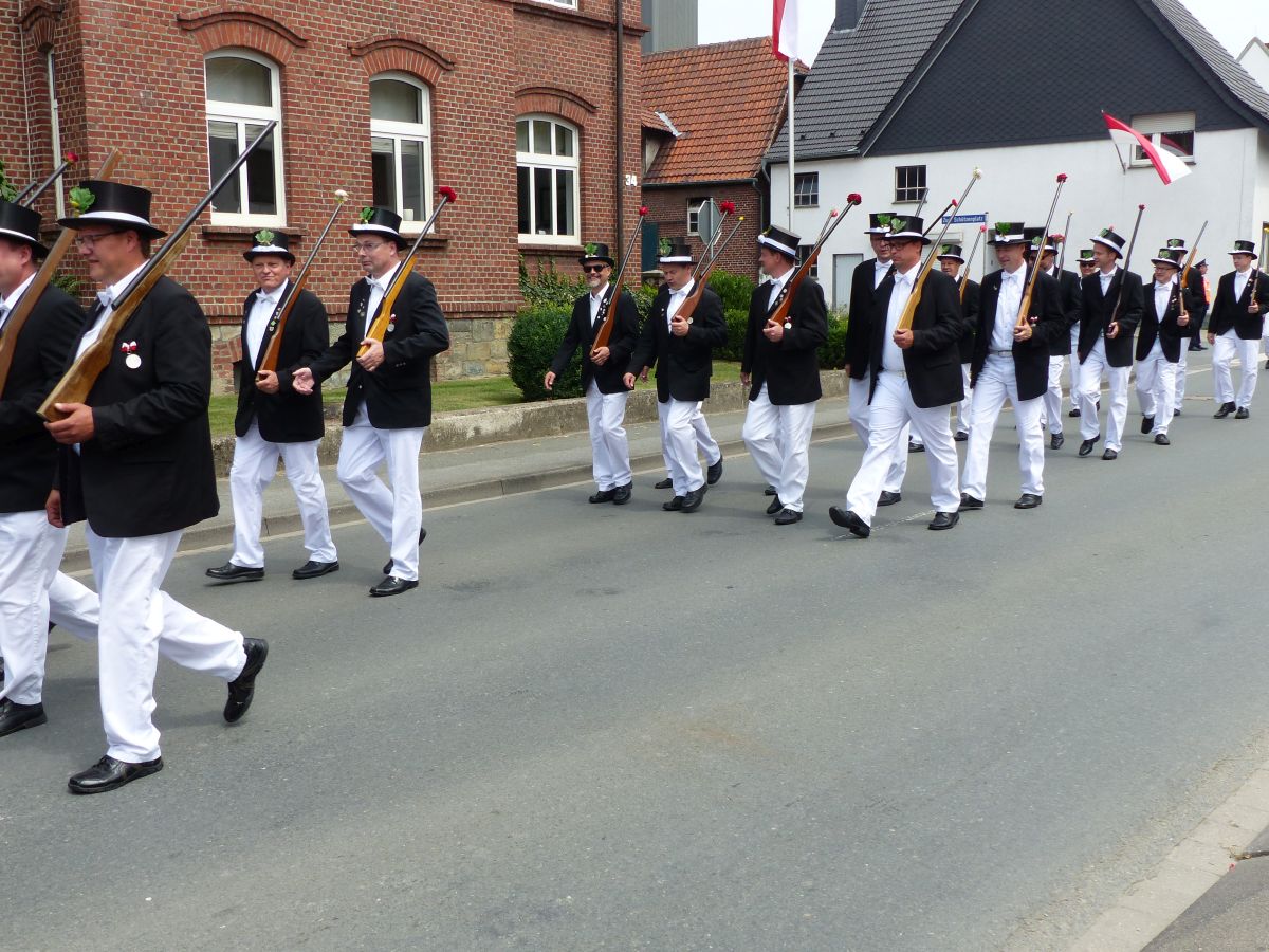 Was wäre ein Schützenfestumzug ohne die Kleider der Hofdamen? Vielleicht nicht ganz so schön anzuschauen… An diesem Sonntag passte alles, das Wetter spielte mit, Königin Marion Harrenkamp und ihre Hofdamen konnten sich in ihren schicken Kleidern, den an der Straße stehenden Besuchern des Umzugs aus Nah und Fern toll präsentieren. Dieses wunderbare Bild rundeten die 25jährige Jubelkönigin Mechthild Lammert und die 40jährige Jubelkönigin Renate Sigge super ab. Die Könige, Franz Harrenkamp, Berthold Lammert und Antonius Sigge brauchten nur noch galant die Hand zum Marschieren reichen. Auf dem Schützenplatz angekommen konnte das Bataillon zeigen wie ein Parademarsch klappt, kurzum Unfälle hat es keine gegeben. Nach dem obligatorischen Blumenstrauß für die Königinnen und den Jubilarsorden für die Jubelkönige wurde noch Dennis Könighaus mit dem Jungschützenkönigsorden 2017 geehrt. Zum Schluss gab es dann die wohlverdienten Ehrungen für die Musikerjubilare: 25 Jahre Musik beim Störmeder Schützenfest: Melanie Stienemeier (Musikzug Störmede); Martin Hunold (Musikzug Störmede), 40 Jahre Musik beim Störmeder Schützenfest: Franz Westermann (Tambourkorps Langeneicke); 50 Jahre Musik beim Störmeder Schützenfest: Willi Lübbert (Tambourkorps Langeneicke), 60 Jahre Musik beim Störmeder Schützenfest: Josef Dömer (Tambourkorps Störmede).