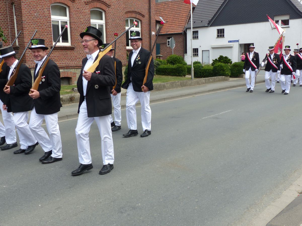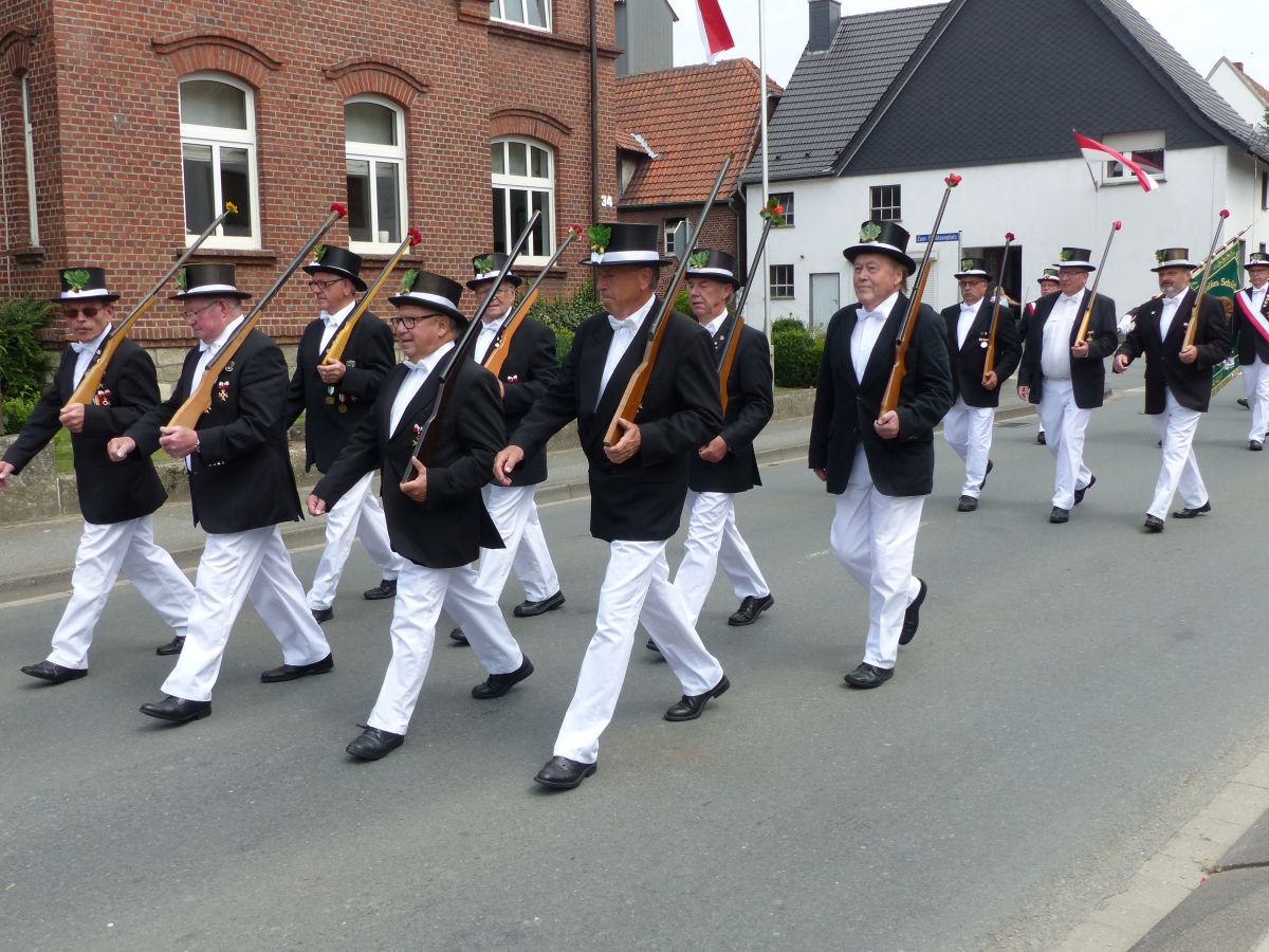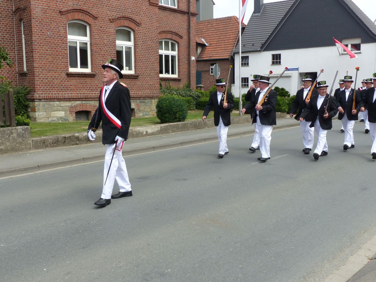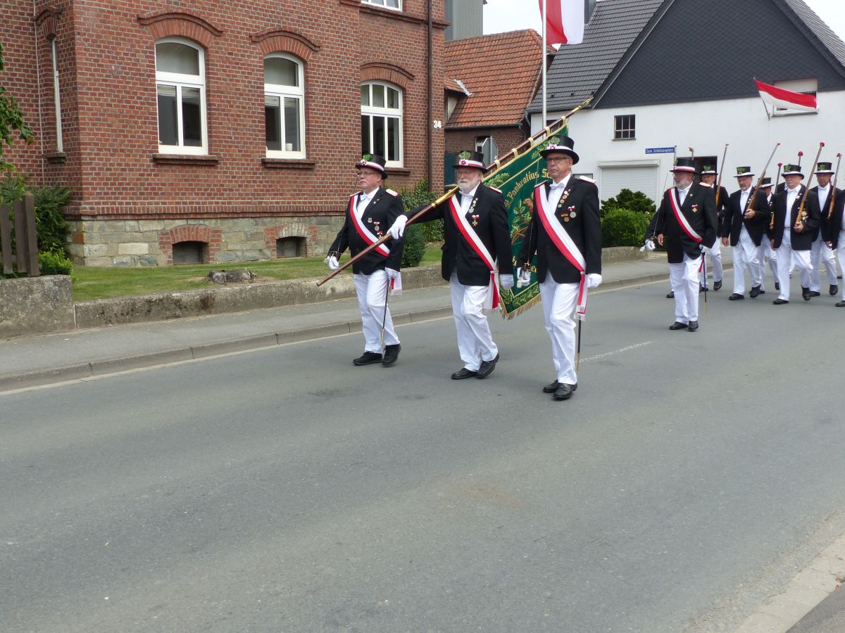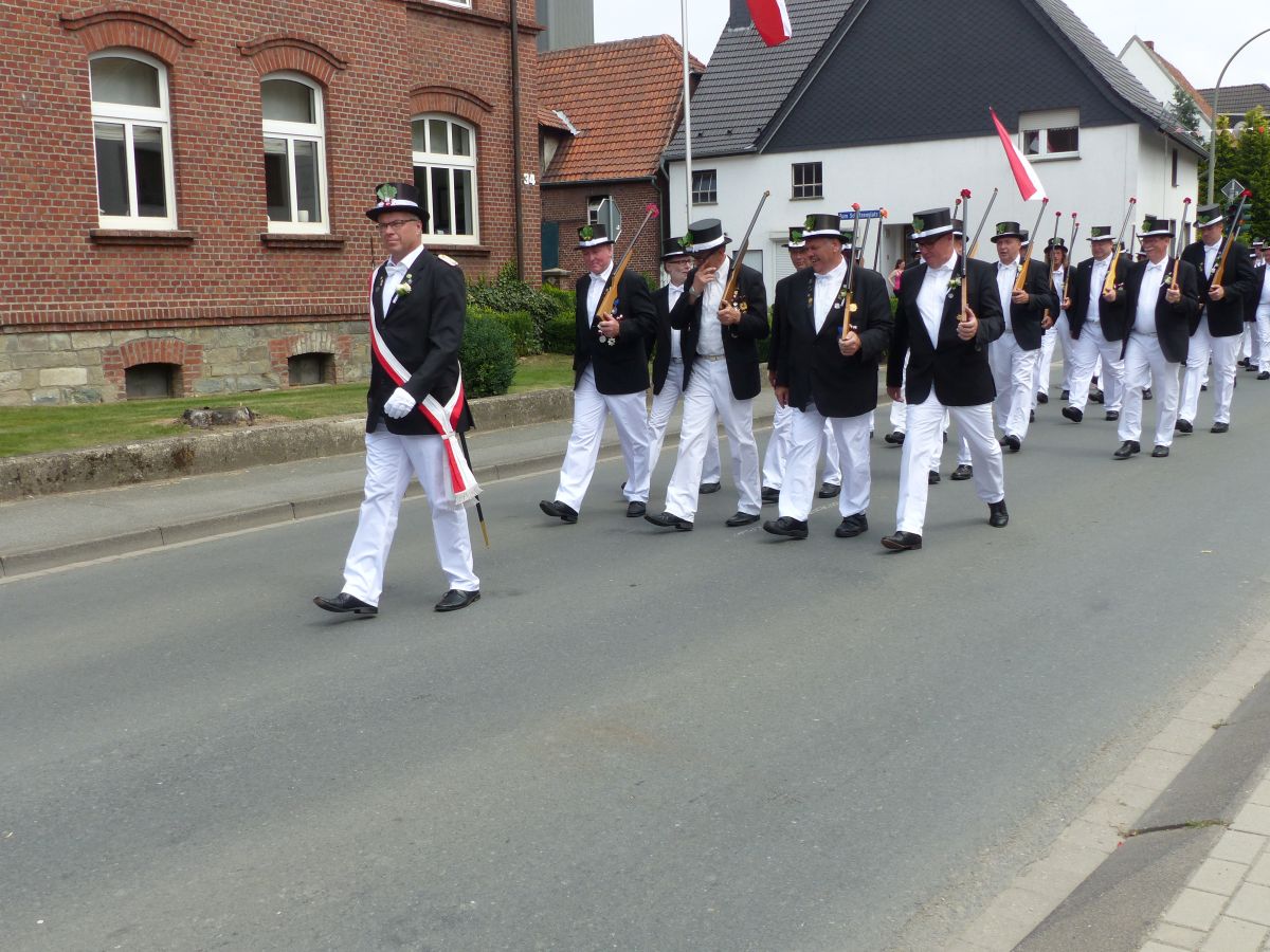 Was wäre ein Schützenfestumzug ohne die Kleider der Hofdamen? Vielleicht nicht ganz so schön anzuschauen… An diesem Sonntag passte alles, das Wetter spielte mit, Königin Marion Harrenkamp und ihre Hofdamen konnten sich in ihren schicken Kleidern, den an der Straße stehenden Besuchern des Umzugs aus Nah und Fern toll präsentieren. Dieses wunderbare Bild rundeten die 25jährige Jubelkönigin Mechthild Lammert und die 40jährige Jubelkönigin Renate Sigge super ab. Die Könige, Franz Harrenkamp, Berthold Lammert und Antonius Sigge brauchten nur noch galant die Hand zum Marschieren reichen. Auf dem Schützenplatz angekommen konnte das Bataillon zeigen wie ein Parademarsch klappt, kurzum Unfälle hat es keine gegeben. Nach dem obligatorischen Blumenstrauß für die Königinnen und den Jubilarsorden für die Jubelkönige wurde noch Dennis Könighaus mit dem Jungschützenkönigsorden 2017 geehrt. Zum Schluss gab es dann die wohlverdienten Ehrungen für die Musikerjubilare: 25 Jahre Musik beim Störmeder Schützenfest: Melanie Stienemeier (Musikzug Störmede); Martin Hunold (Musikzug Störmede), 40 Jahre Musik beim Störmeder Schützenfest: Franz Westermann (Tambourkorps Langeneicke); 50 Jahre Musik beim Störmeder Schützenfest: Willi Lübbert (Tambourkorps Langeneicke), 60 Jahre Musik beim Störmeder Schützenfest: Josef Dömer (Tambourkorps Störmede).