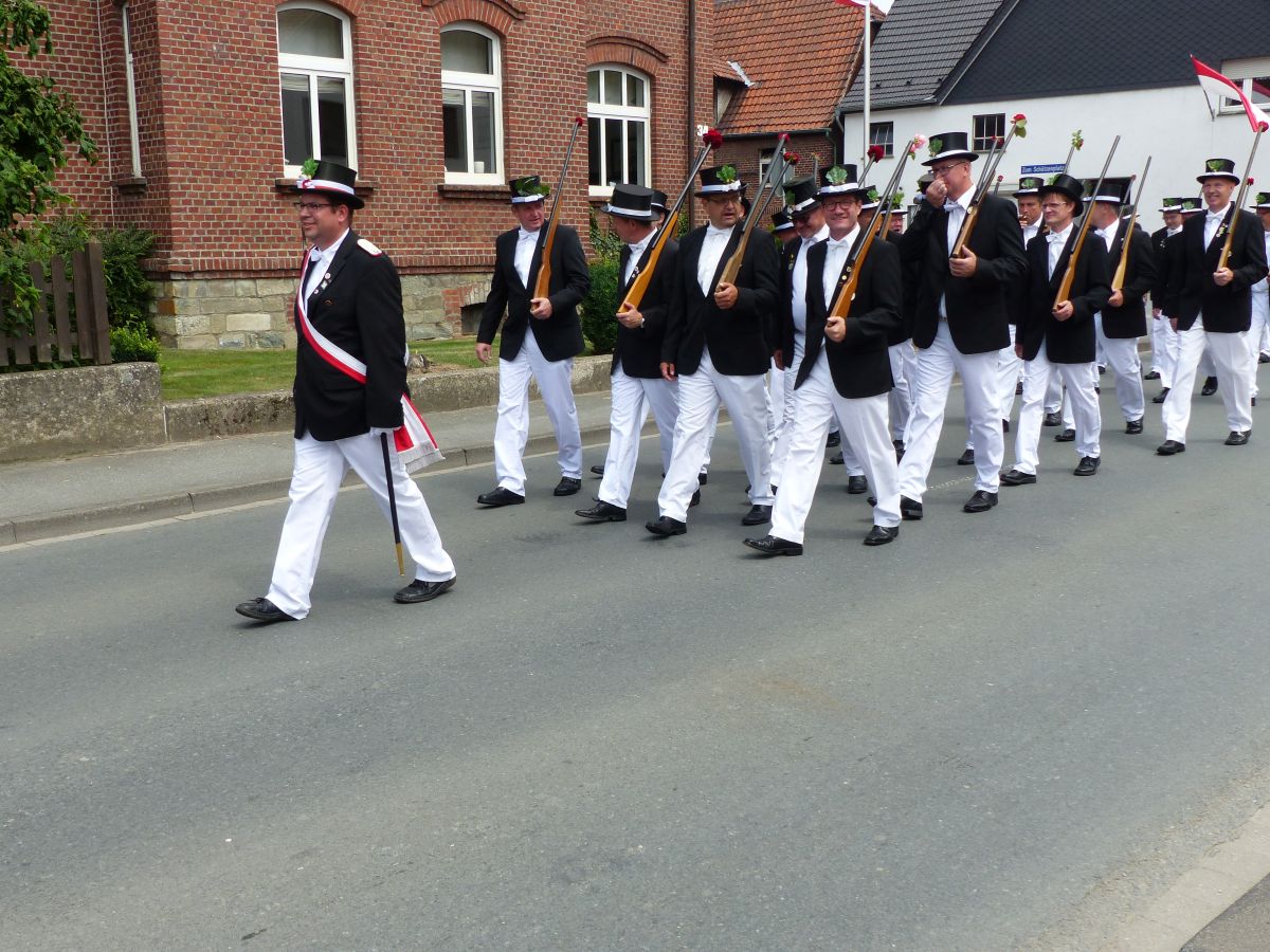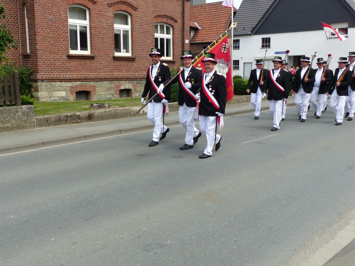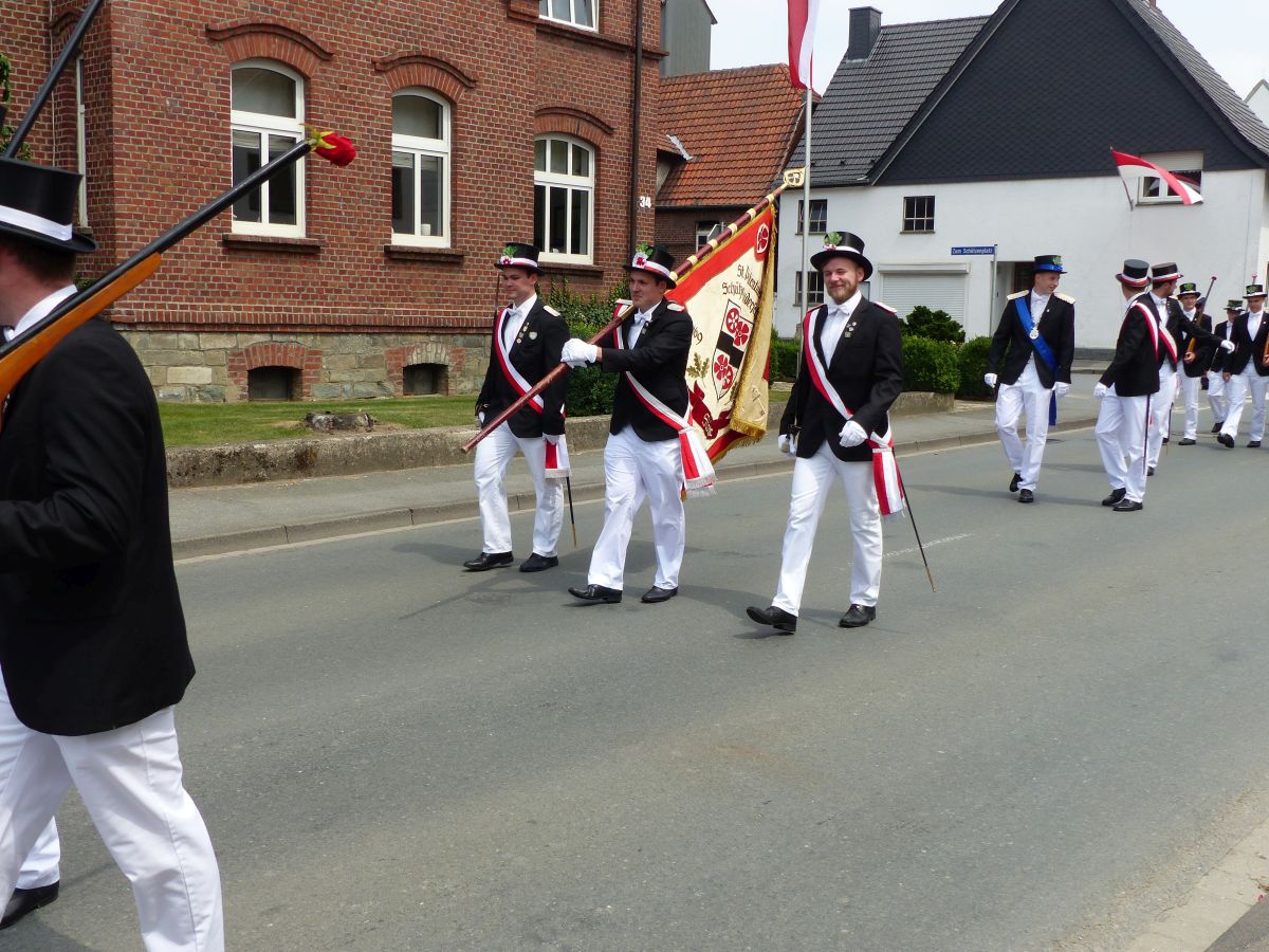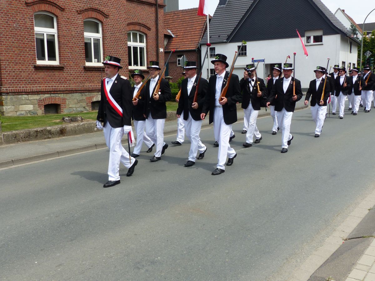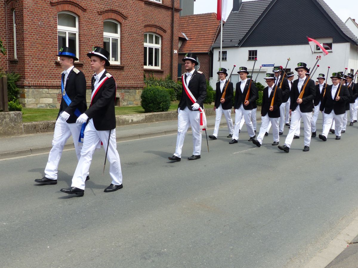 Was wäre ein Schützenfestumzug ohne die Kleider der Hofdamen? Vielleicht nicht ganz so schön anzuschauen… An diesem Sonntag passte alles, das Wetter spielte mit, Königin Marion Harrenkamp und ihre Hofdamen konnten sich in ihren schicken Kleidern, den an der Straße stehenden Besuchern des Umzugs aus Nah und Fern toll präsentieren. Dieses wunderbare Bild rundeten die 25jährige Jubelkönigin Mechthild Lammert und die 40jährige Jubelkönigin Renate Sigge super ab. Die Könige, Franz Harrenkamp, Berthold Lammert und Antonius Sigge brauchten nur noch galant die Hand zum Marschieren reichen. Auf dem Schützenplatz angekommen konnte das Bataillon zeigen wie ein Parademarsch klappt, kurzum Unfälle hat es keine gegeben. Nach dem obligatorischen Blumenstrauß für die Königinnen und den Jubilarsorden für die Jubelkönige wurde noch Dennis Könighaus mit dem Jungschützenkönigsorden 2017 geehrt. Zum Schluss gab es dann die wohlverdienten Ehrungen für die Musikerjubilare: 25 Jahre Musik beim Störmeder Schützenfest: Melanie Stienemeier (Musikzug Störmede); Martin Hunold (Musikzug Störmede), 40 Jahre Musik beim Störmeder Schützenfest: Franz Westermann (Tambourkorps Langeneicke); 50 Jahre Musik beim Störmeder Schützenfest: Willi Lübbert (Tambourkorps Langeneicke), 60 Jahre Musik beim Störmeder Schützenfest: Josef Dömer (Tambourkorps Störmede).